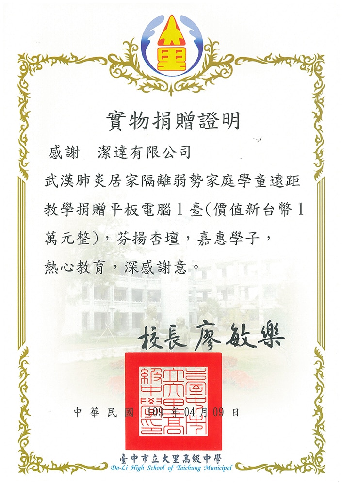 潔達感謝狀